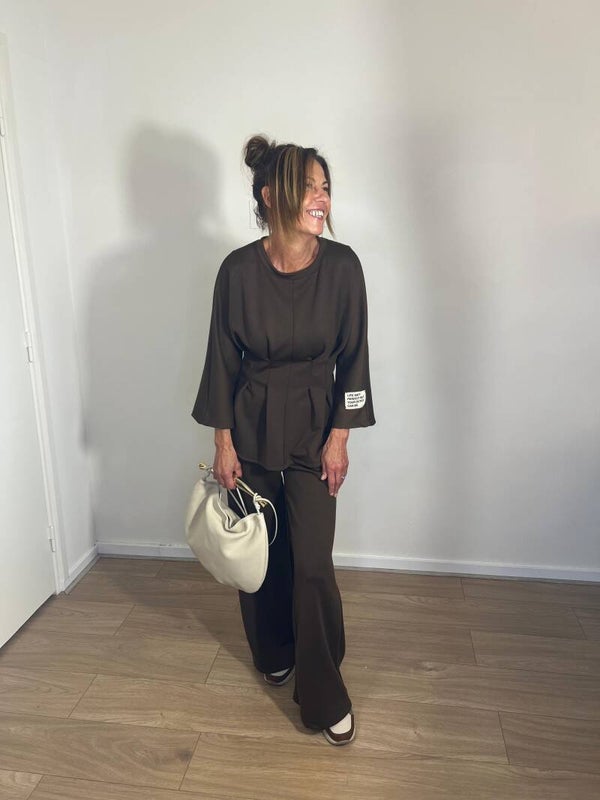 Een lekker zacht tweedelig pak met een getailleerde taille,broek wijde uitloop,mouwen.