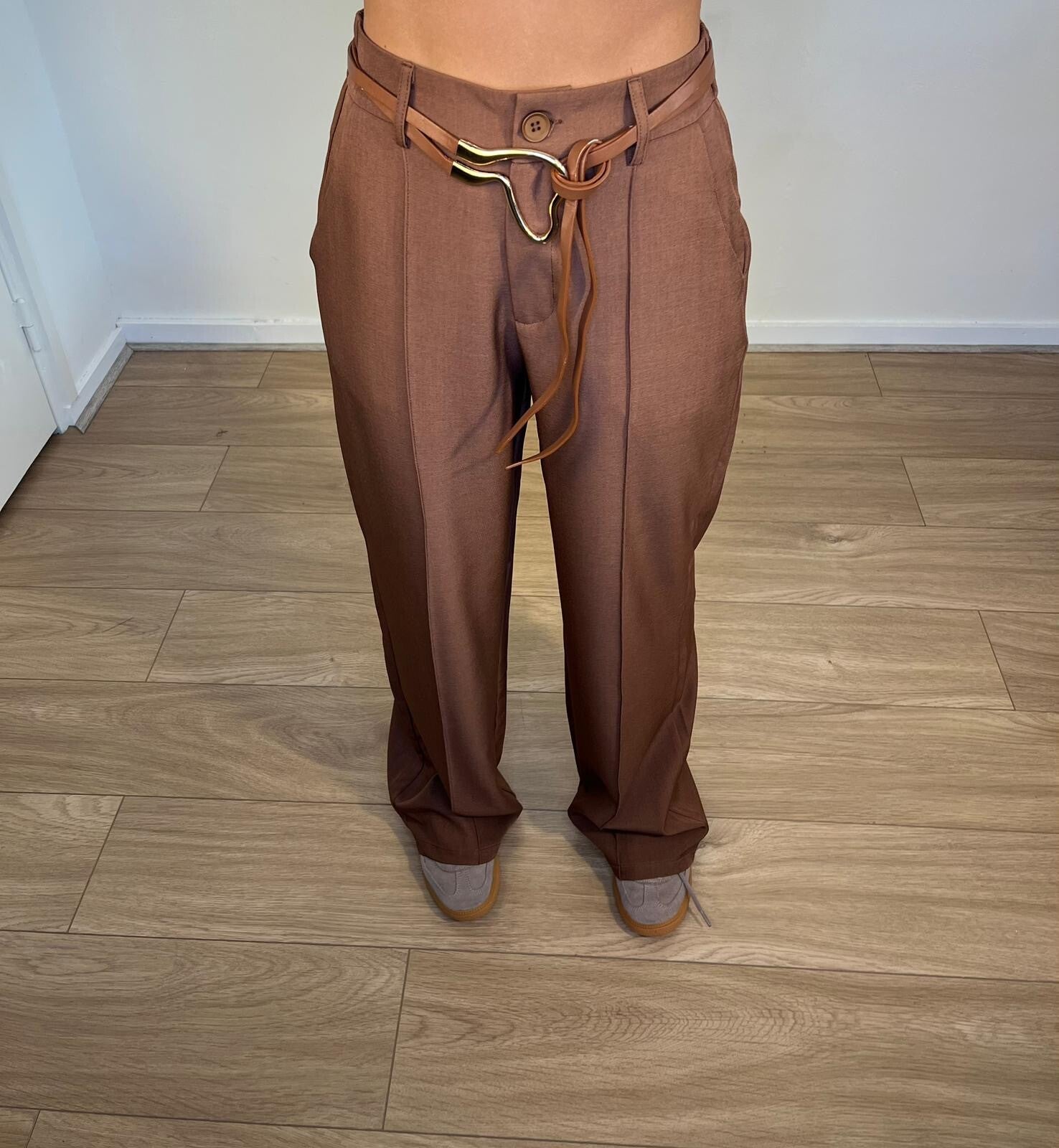 Hele mooie pantalon in de kleur bruin, met een leuk riemdetail