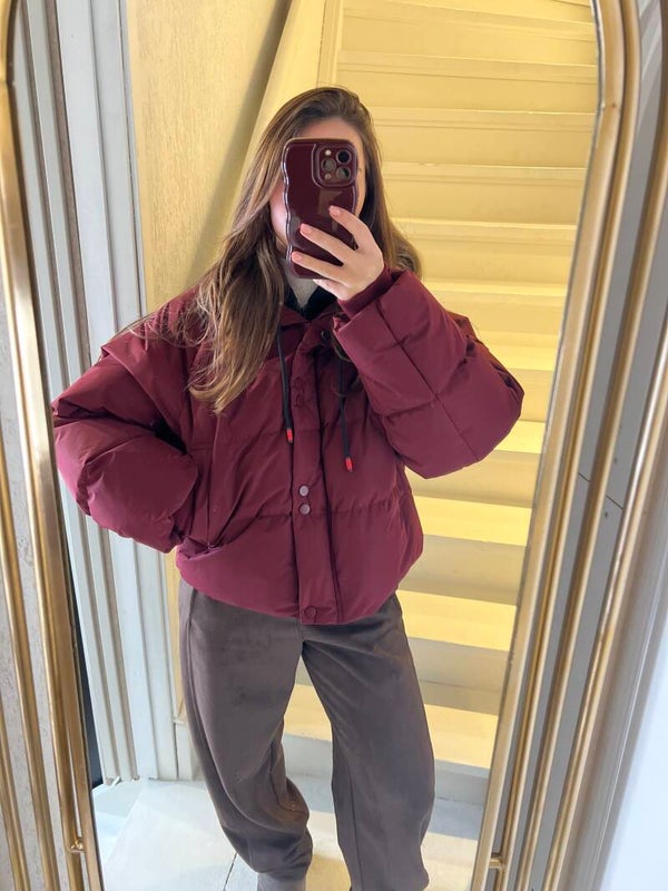 Maak je winterlooks compleet met deze stijlvolle bordeaux rode puffer jas met inside hoodie. De warme, zachte vulling en het comfortabele one-size design maken dit jasje perfect voor koude dagen. De hoodie is er ook uit te halen.