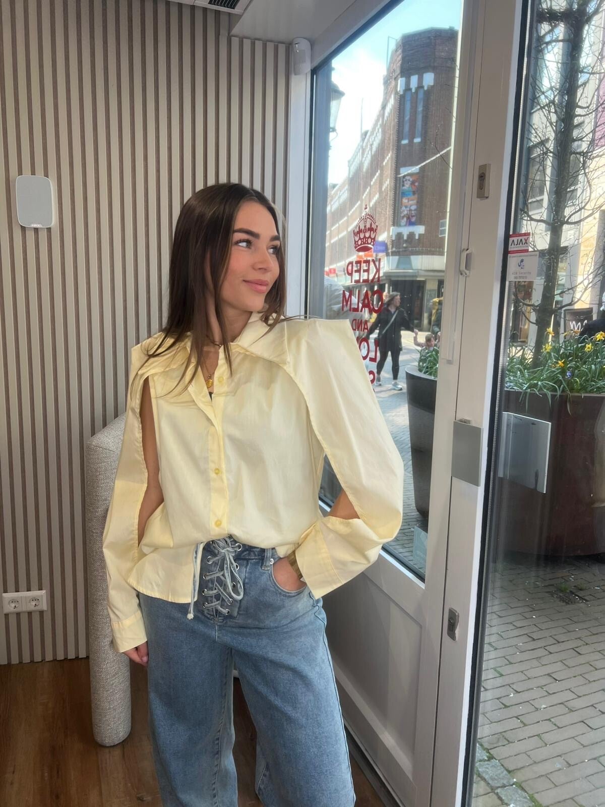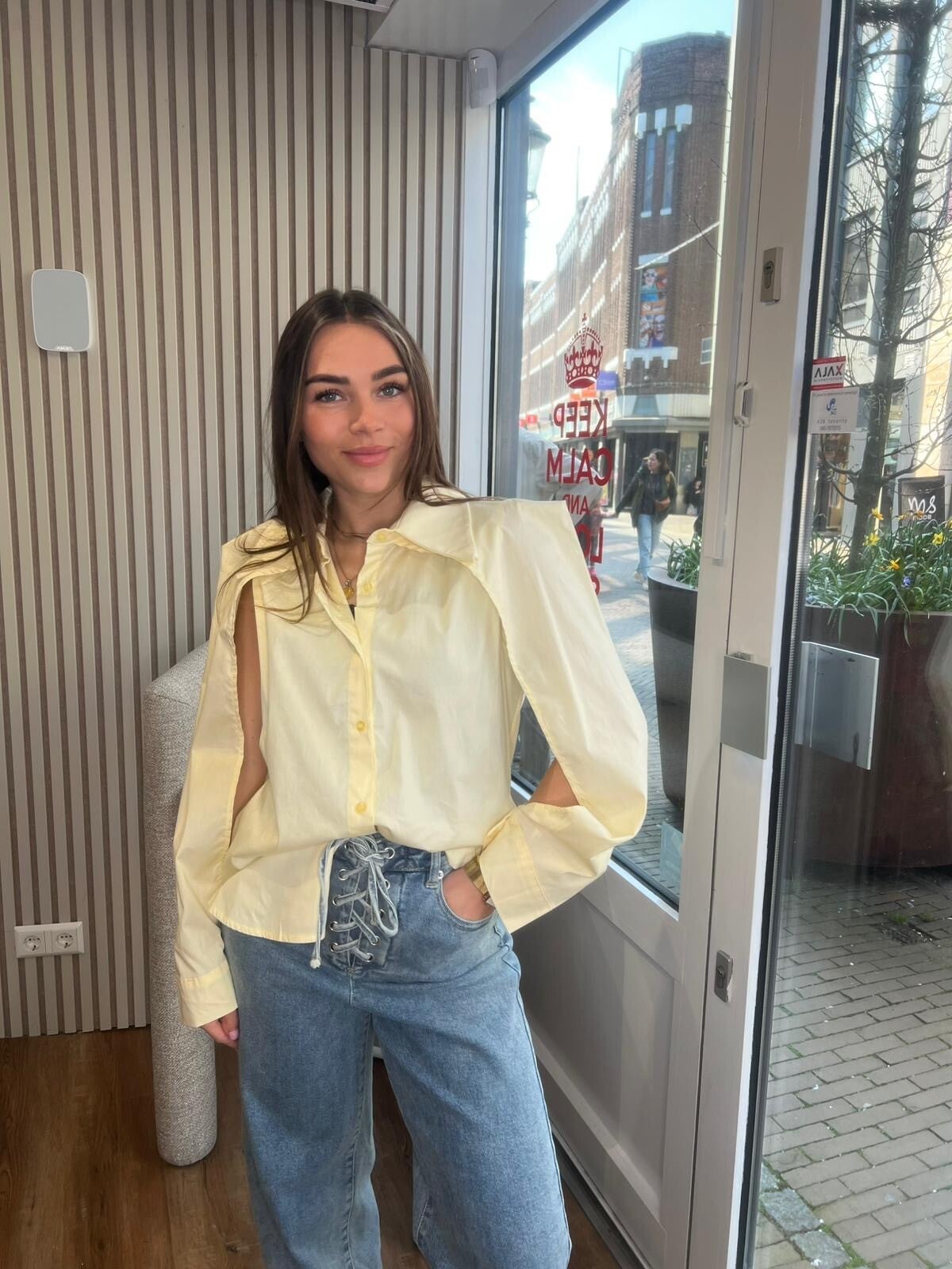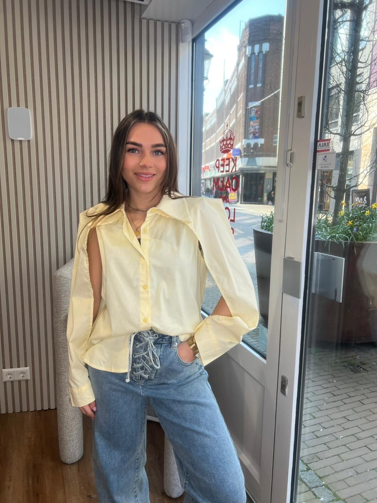 Deze geweldige cut open sleeve blouse met een straight fit in de kleur geel mag toch niet ontbreken in jouw garderobe?