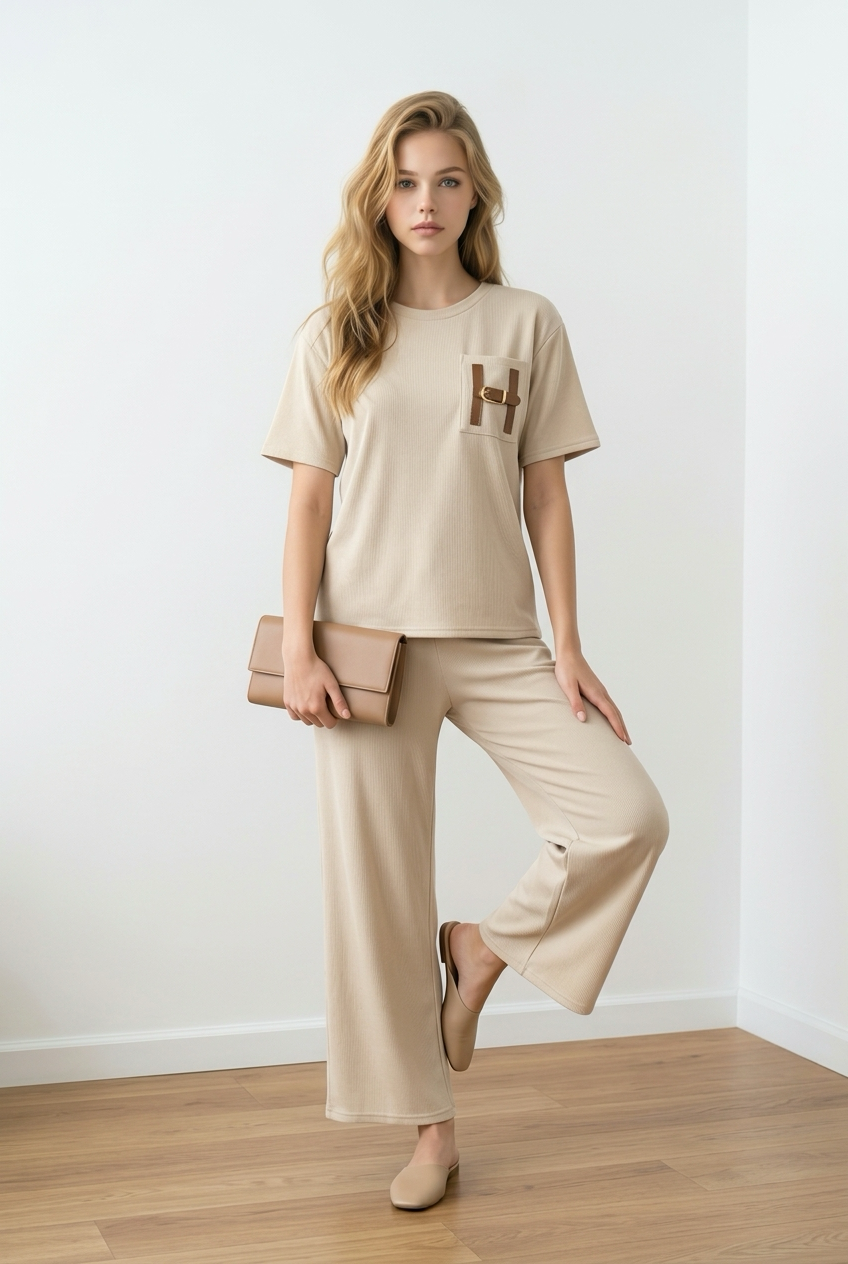 Ga voor een frisse en tijdloze look met deze stijlvolle Creme set. De zachte ribstof voelt comfortabel aan en geeft een subtiele, luxe uitstraling. De top met verfijnd detail op de borst zorgt voor een elegante touch, terwijl de soepelvallende broek met wijde pijpen een relaxte en moderne fit creëert. Perfect voor de zomerdagen.
